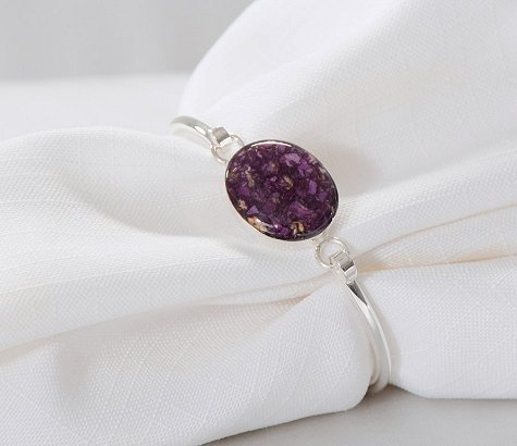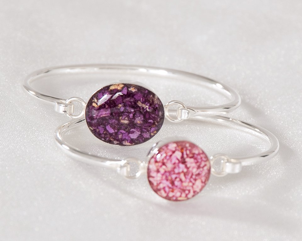 A beautiful remembrance of your special memories. Our Sterling Silver version of the classic bangle bracelet adds new meaning to simple sophistication. Highly polished Sterling Silver bangle complimented by an elegant crystal clear display of your special Keepsake flowers.