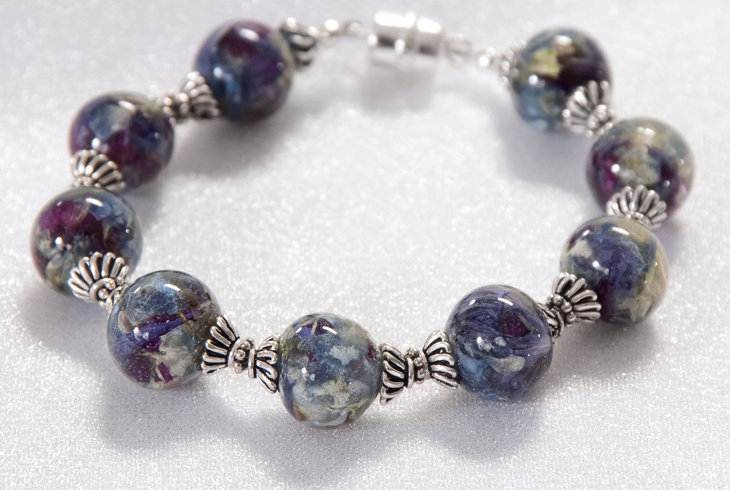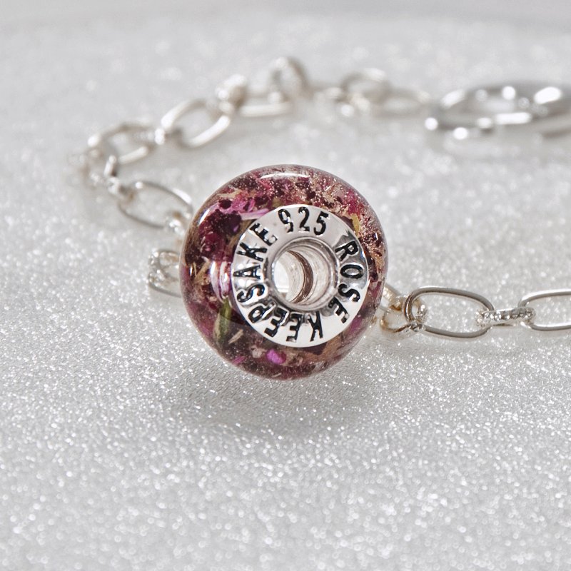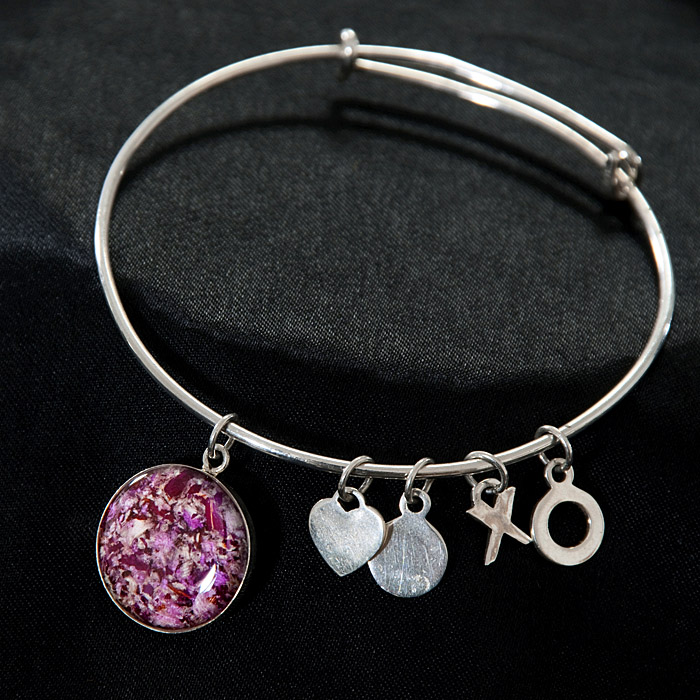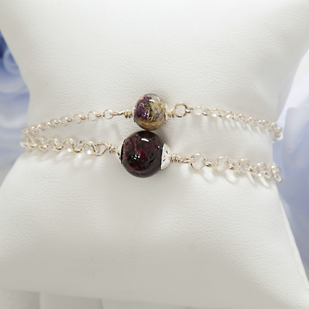 Our “Flowers In Glass” Bracelets are a perfect way to preserve and display your treasured memories. This bracelet displays your flowers in crystal clear glass bead.