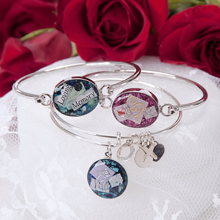 [/fusion_text][fusion_text columns=”” column_min_width=”” column_spacing=”” rule_style=”default” rule_size=”” rule_color=”” hide_on_mobile=”small-visibility,medium-visibility,large-visibility” class=”” id=””]A beautiful remembrance of your special memories. Our Sterling Silver version of the classic bangle bracelet adds new meaning to simple sophistication. Highly polished Sterling Silver bangle complimented by an elegant crystal clear display of your special Keepsake flowers.