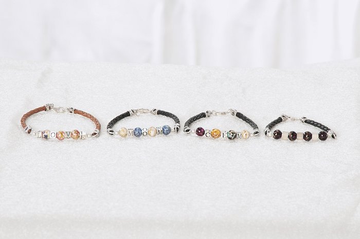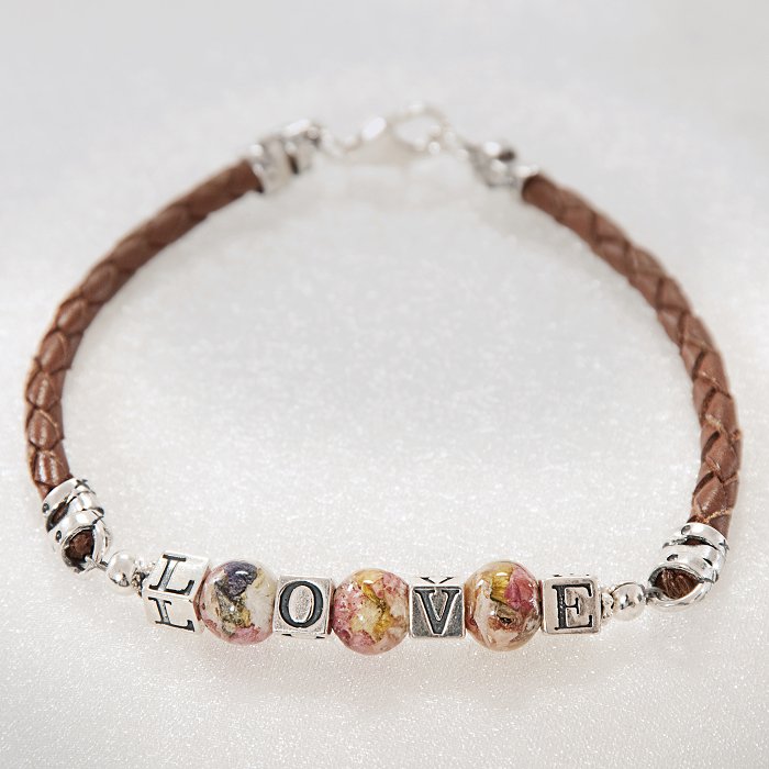 [/fusion_text][fusion_text columns=”” column_min_width=”” column_spacing=”” rule_style=”default” rule_size=”” rule_color=”” hide_on_mobile=”small-visibility,medium-visibility,large-visibility” class=”” id=””]Stylish braided leather combined with our ”Flowers in Glass” beads makes the perfect every day accessory. Customizable, with up to four sterling silver letters, these bracelets are a great way to display and wear your flowers for both men and women. These bracelets are fully customizable, in order to insure that the bracelet fits properly, we ask that you include the wrist measurement (not the bracelet size) of the intended wearer.