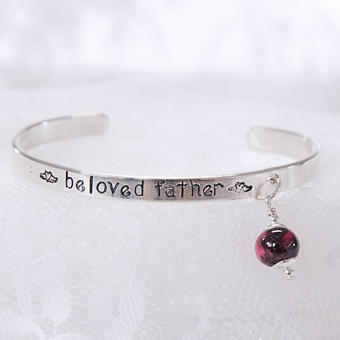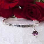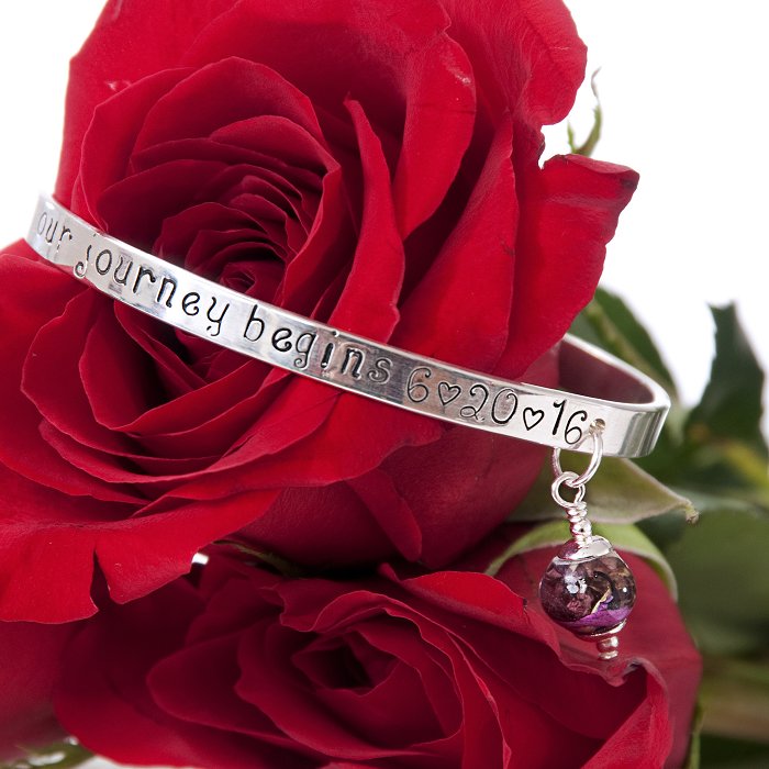 Our Sterling Silver “Words from the Heart” cuff bracelet- this bracelet is custom made with words from your heart up to 40 characters. Let us know what you would like your bracelet to say and we can hand inscribe your heartfelt phrases from a loved one, favorite quotes, the names of loved ones, important dates, or anything that holds meaning to you the possibilities are endless. This bracelet also features your flowers preserved in our flowers in glass bead. This precious bracelet has endless gifting possibilities for weddings, memorials, graduations, and much more! In order to insure that the bracelet fits properly, we ask that you include the wrist measurement (not the bracelet size) of the intended wearer.