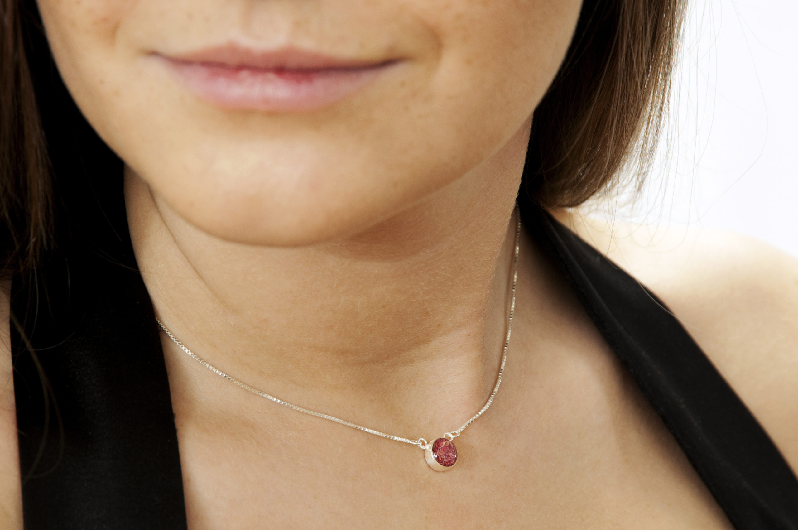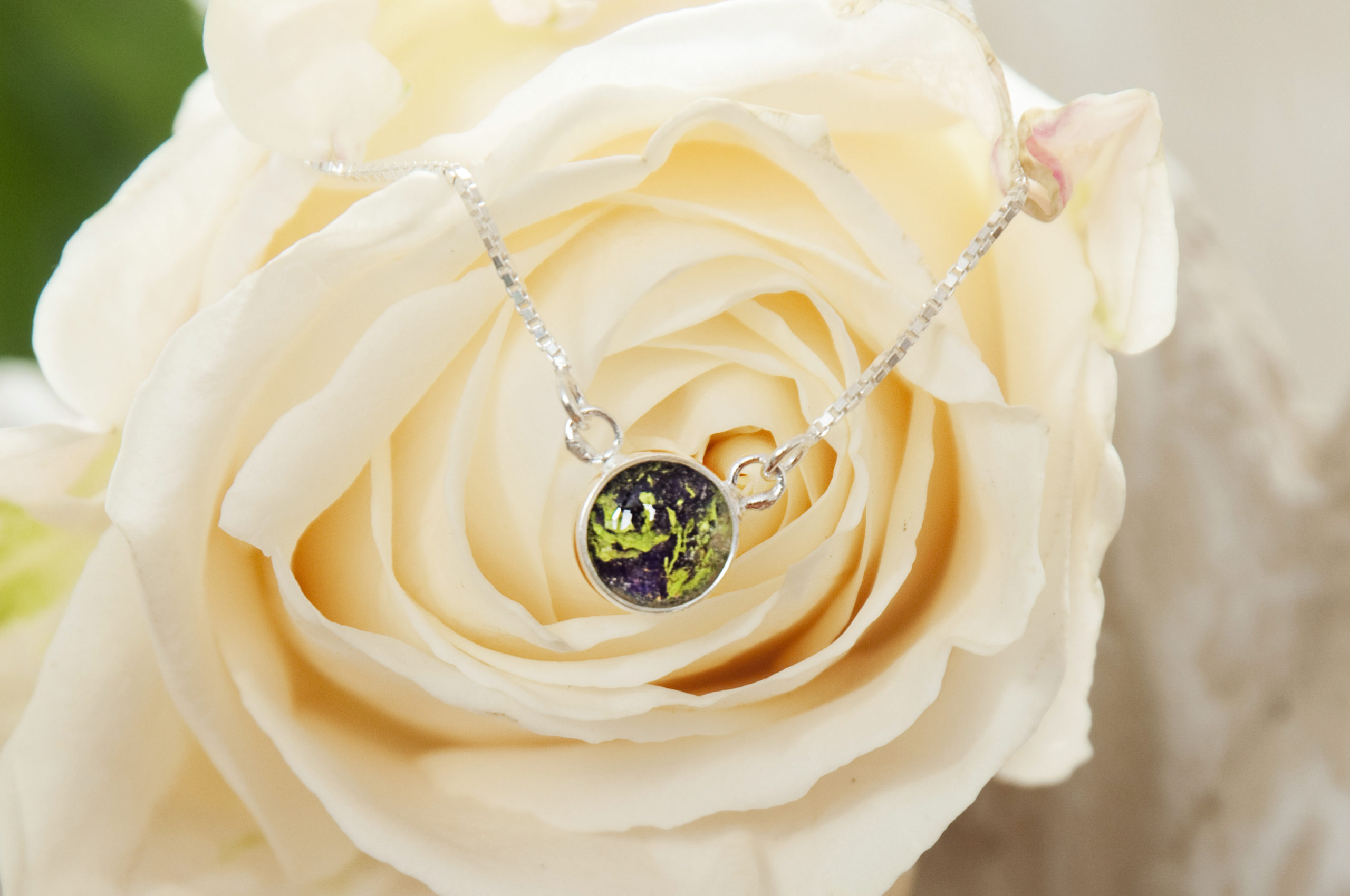 A perfect little necklace! Your flowers are displayed in a 1/4″ round window which suspends from a delicate Sterling Silver box chain. This necklace is a petite and elegant way to keep your special event flowers close to your heart.