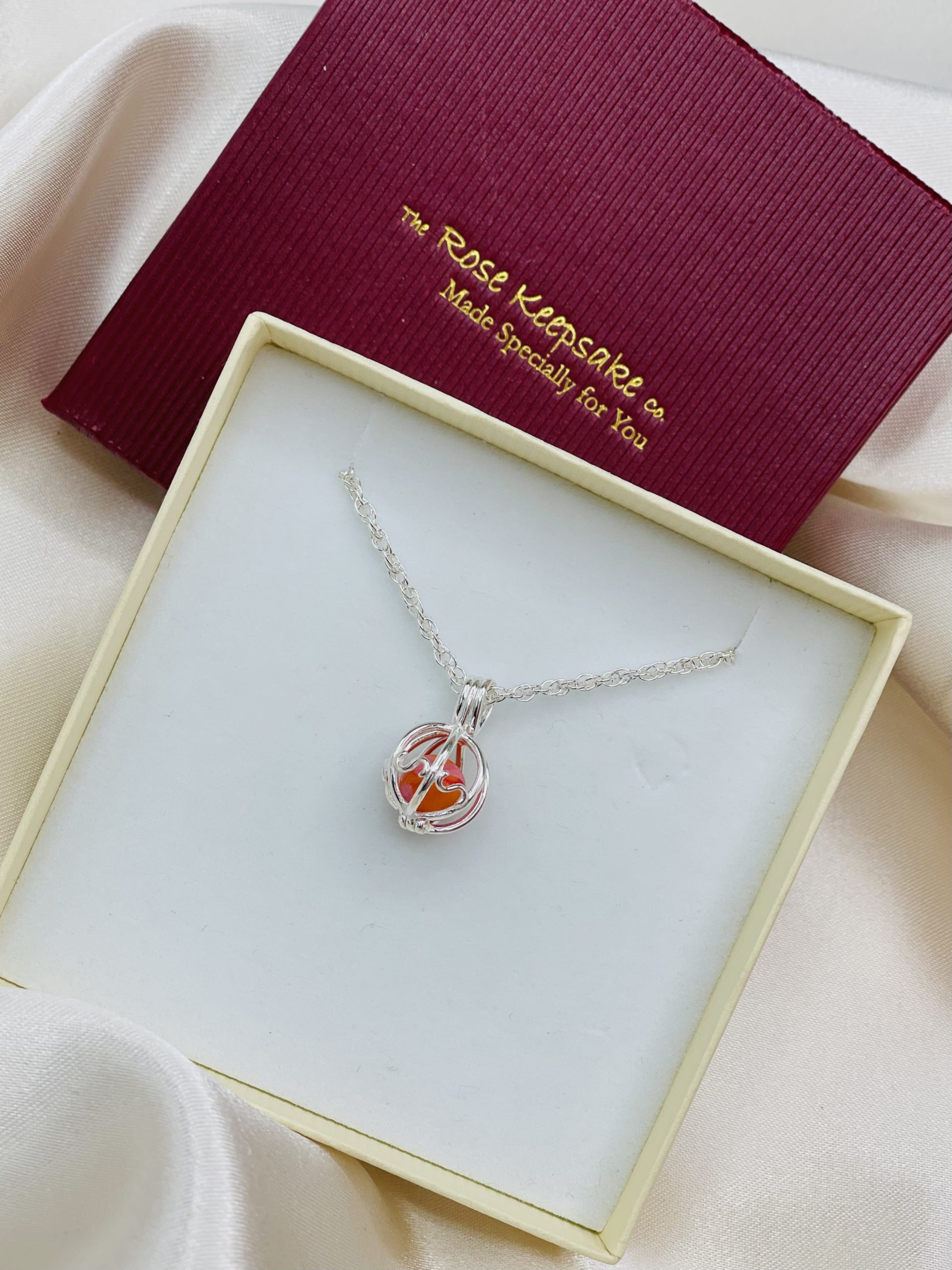 Simple and understated Elegance. Sterling Silver chain with Flower Petal bead encased in a Sterling Silver basket
